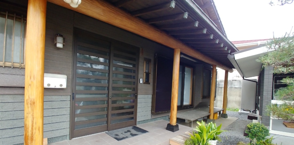 施工前玄関柱と丸桁が玄関側と裏側にあり、経年劣化によって汚れ、カビや割れが多く出ていました