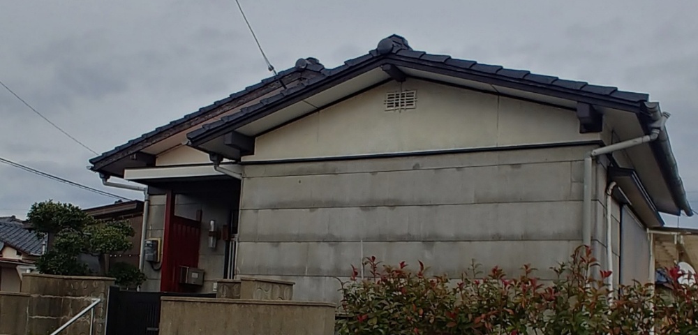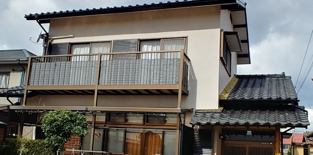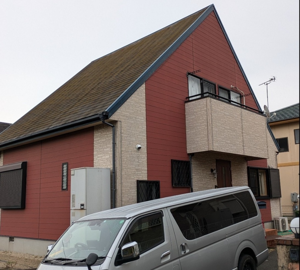 施工前スレート屋根に旧塗膜の薄れや剥がれ、外壁に経年劣化による汚れの症状がありました