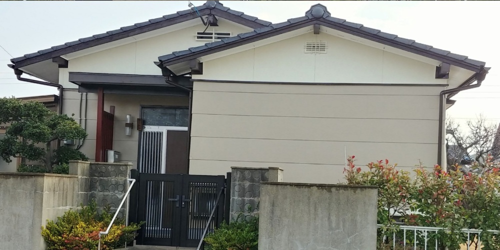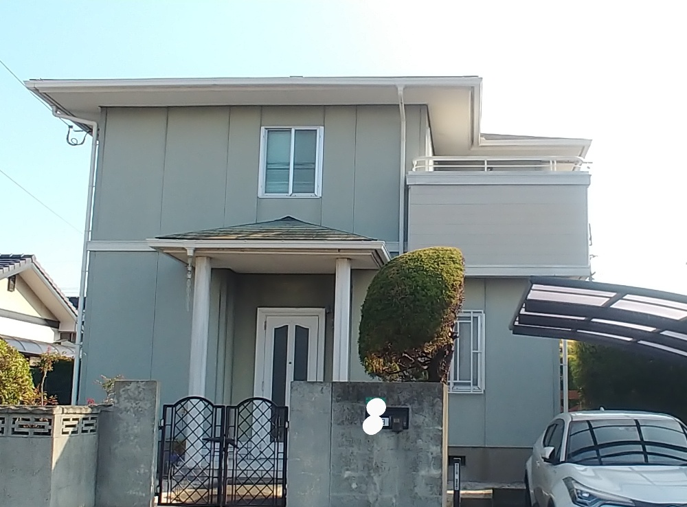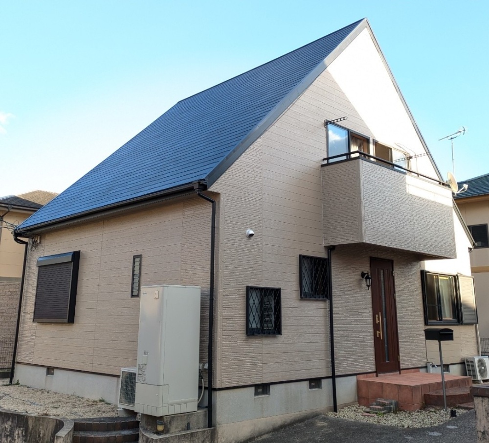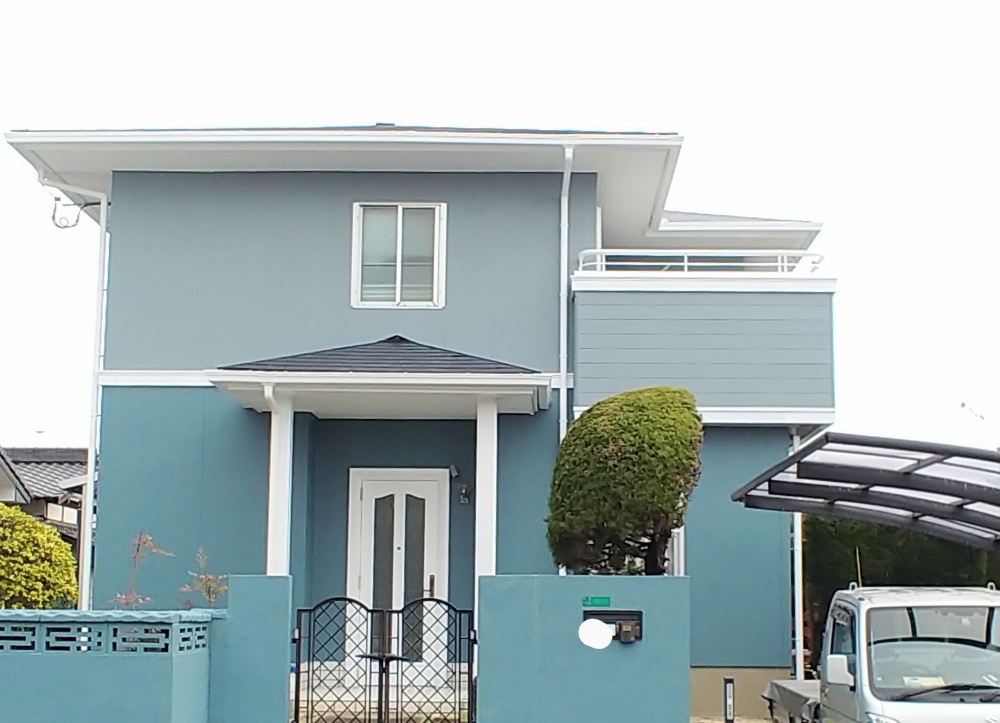 施工後使用塗料(メーカー)・外壁 プレミアムシリコン塗料(エスケー化研)・スレート屋根 水性ルーフセラ遮熱(日本特殊塗料)・付帯部分 クリーンマイルドシリコン(エスケー化研)