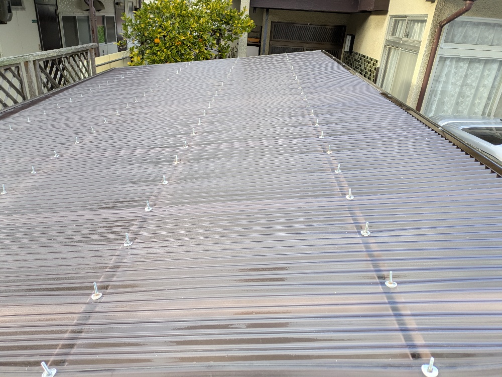 施工後耐候性のある波板に交換しました✨風を受けやすい場所であったため、前方に補強も施しました😃