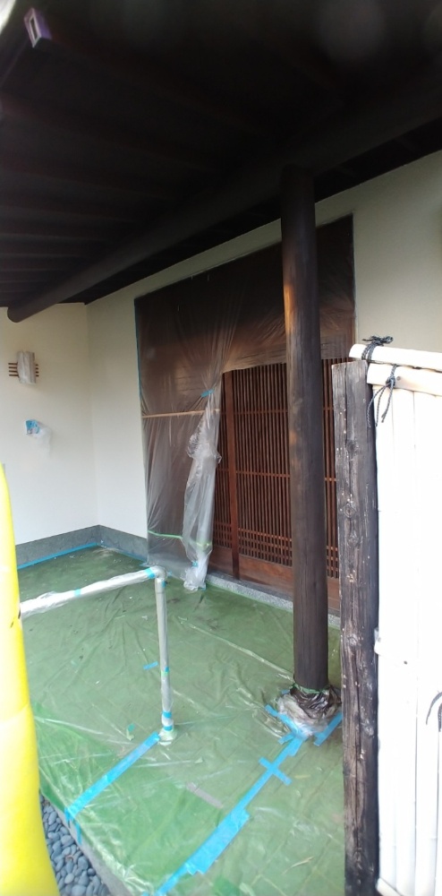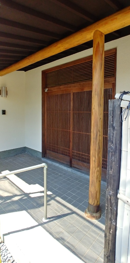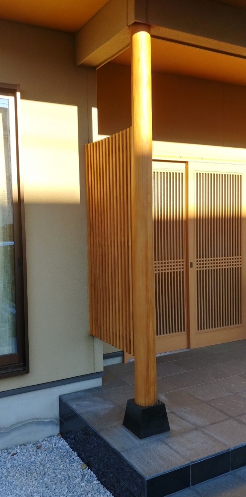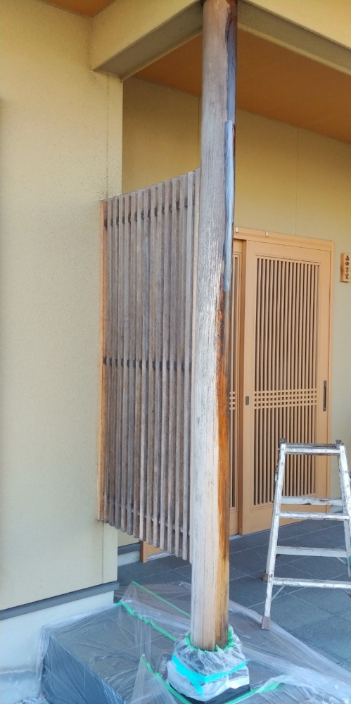 施工前木製の玄関柱・格子が経年劣化により汚れていました
