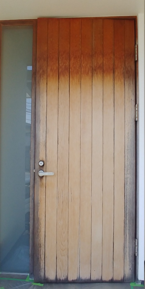 施工前木製の玄関ドアが雨風にさらされ、カビや旧塗料の剥がれが発生していました