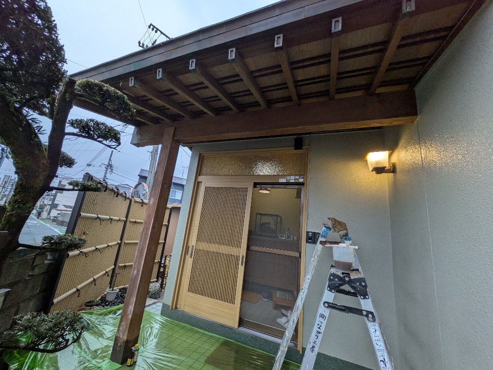 施工後玄関柱、桁、下の木部一式アク洗い作業を施し、防虫防腐剤での仕上げとなりました✨