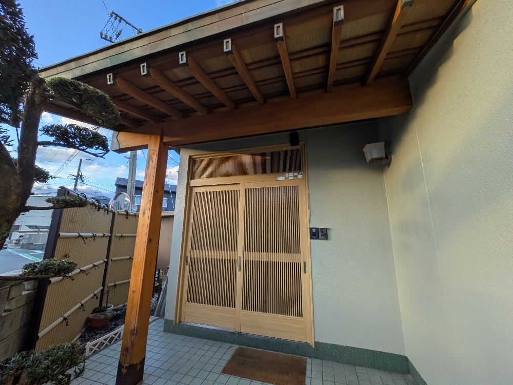 施工後玄関まわりの木部一式、磨き作業を施工仕上げは木部用防虫防腐剤を塗布し、保護しました✨