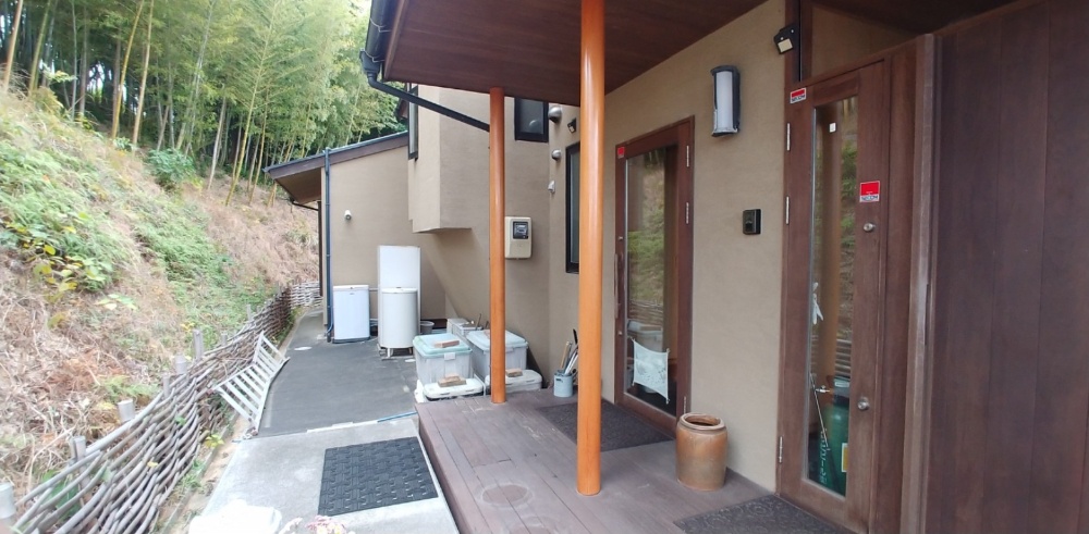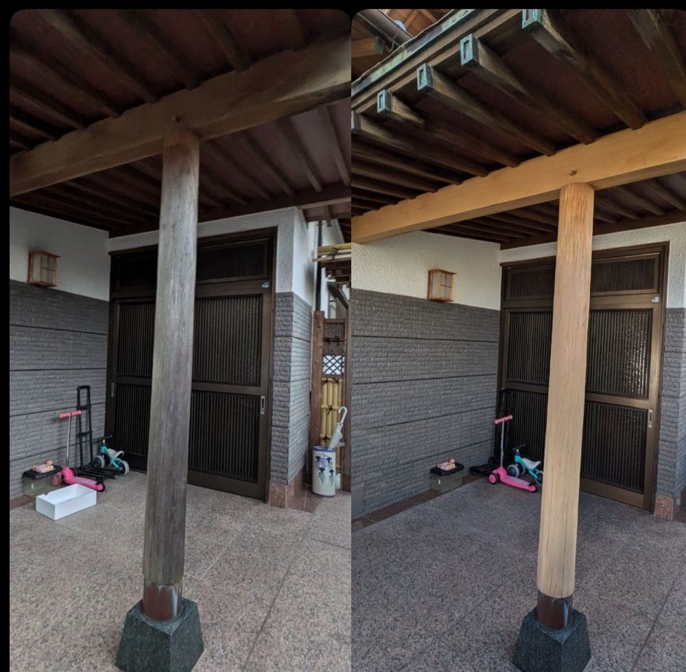 施工後玄関柱をアク洗いし、仕上げに防虫防腐剤で保護いたしました✨
