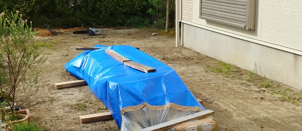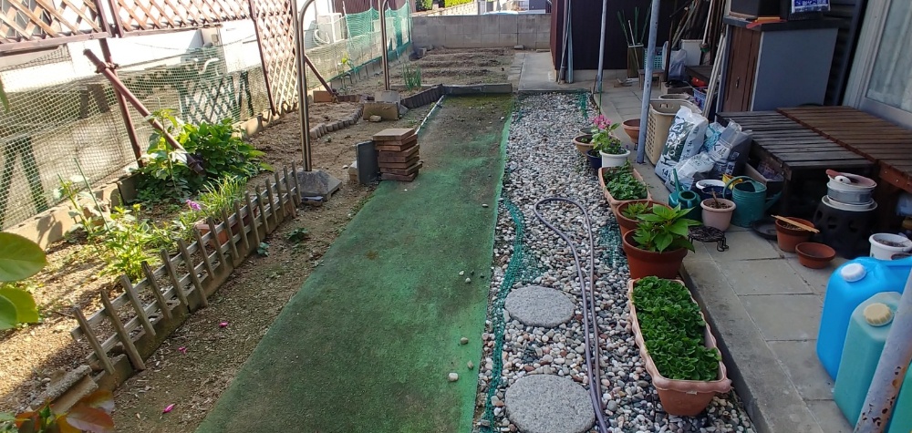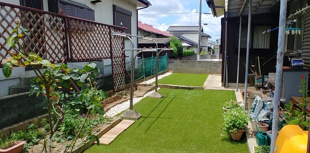 施工後人工芝と砂利を敷き、夏の大敵、雑草への対策工事を施しました😄