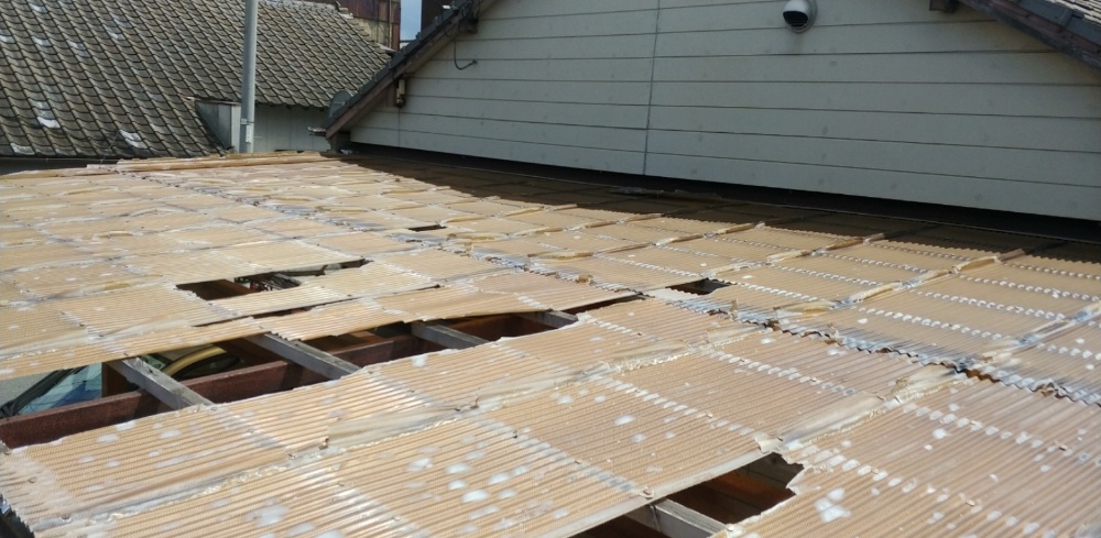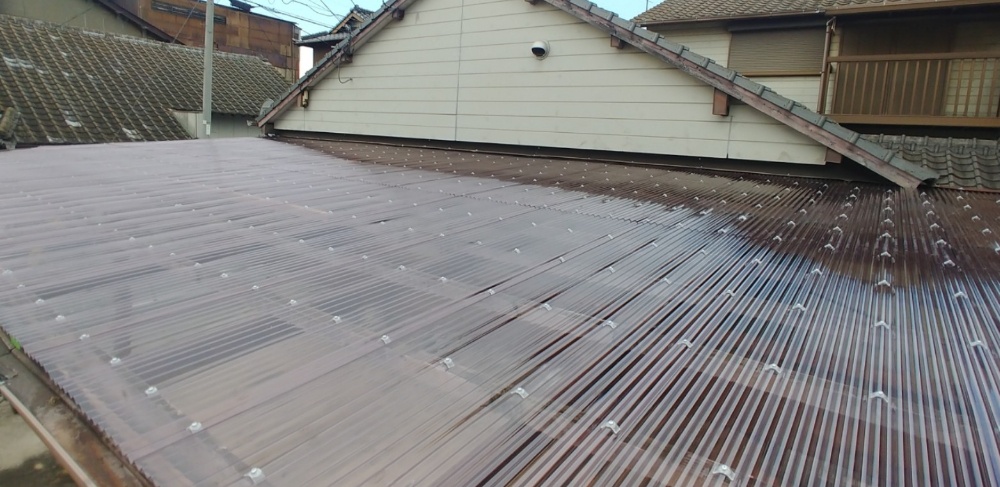 施工前経年劣化により剥がれ欠落したポリカーボネート波板の交換
