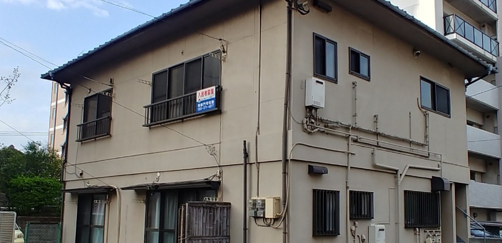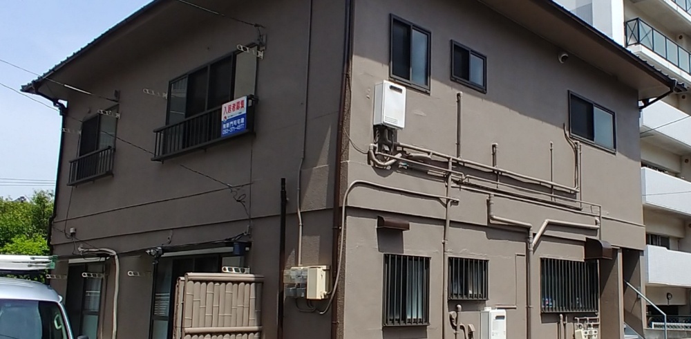 施工前コーポ賃貸物件モルタル外壁にクラックやカビ、旧塗膜の剥がれが複数発生していました