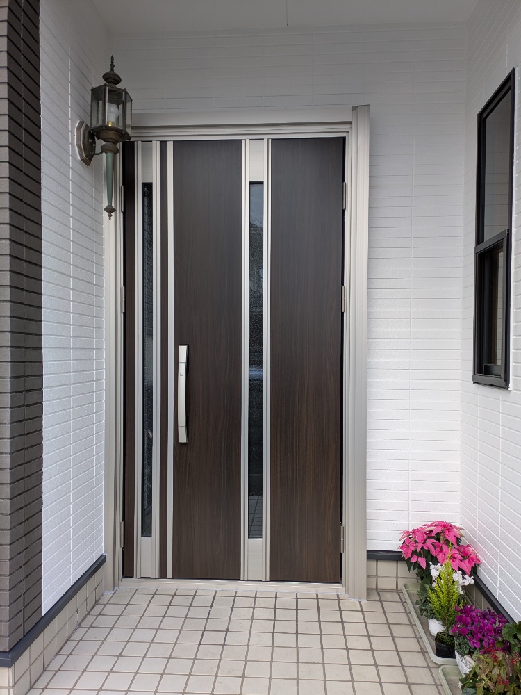 施工後ドアリモ工事サッシドアをカバー工法で施工カバー工法により、工期が短縮され施工時間は1日!工事のために仕事を休んだりする負担を軽減することがてきてご好評いただいています😄