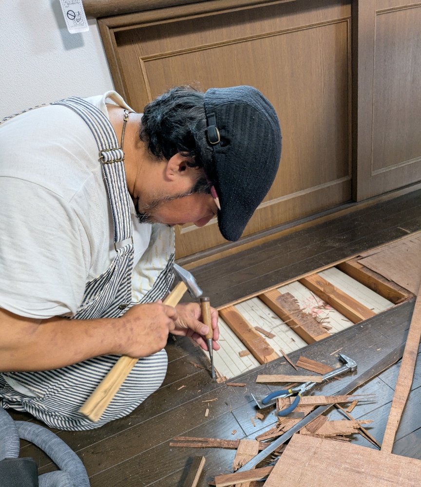 西本・お喋りが好きでいつも明るい大工さん✨大阪万博ではカタール棟の天井を担当しました!細かい箇所まで正確に施工を施してくれます😃